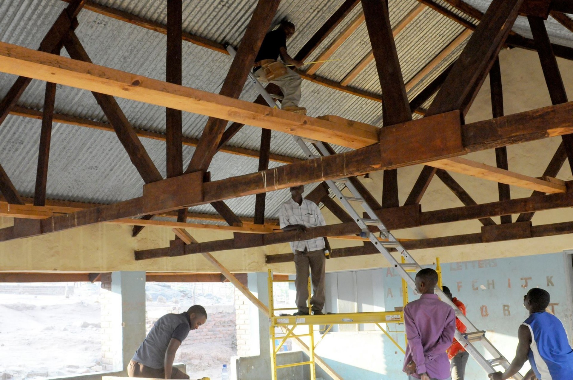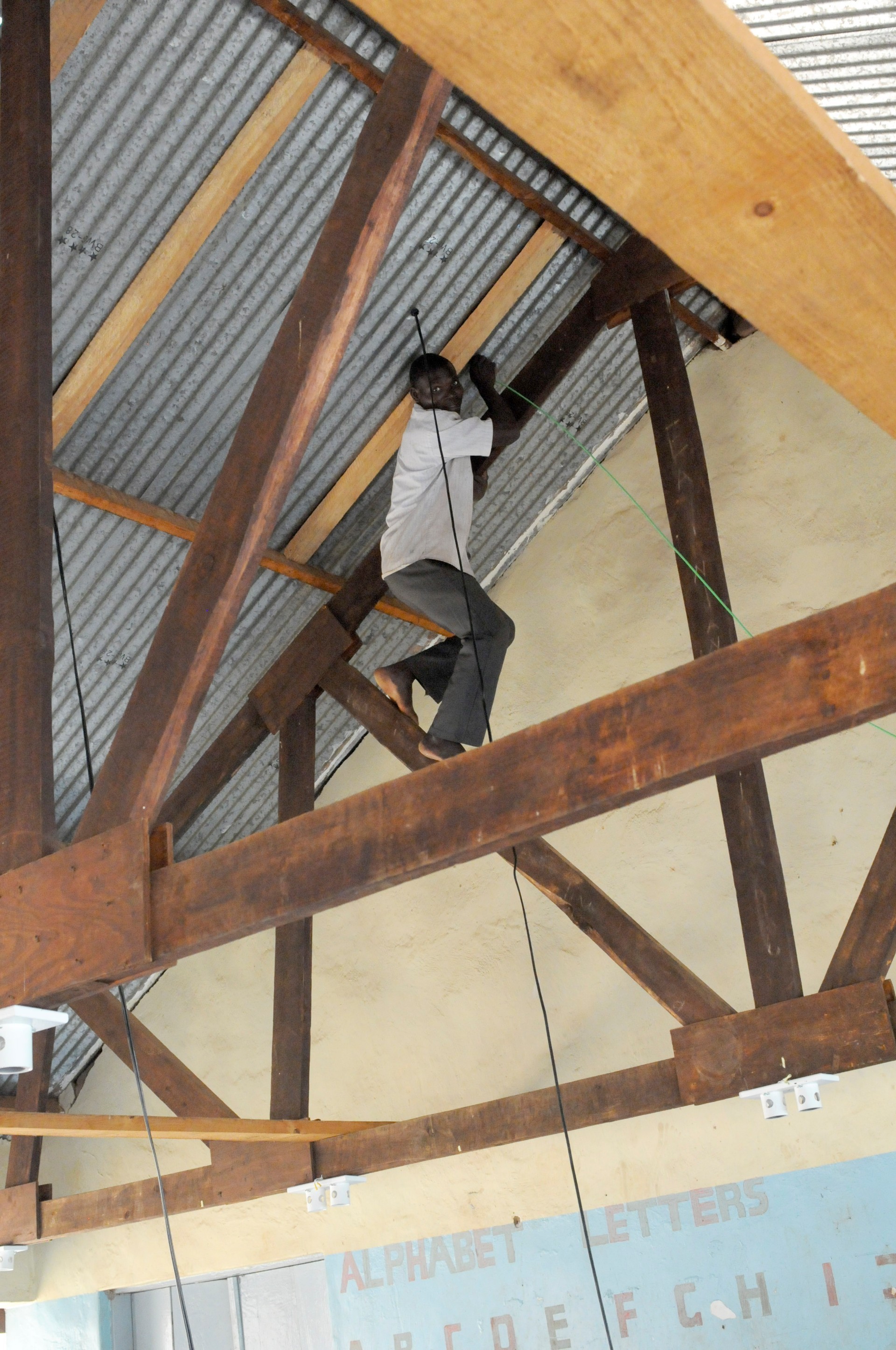 Mounting our panel frames to the roof requires adding timber reinforcing to the widely spaced trusses, to withstand the rainy season storms, and provide security. This can require creativity. Years ago we shipped a ladder and rolling scaffold, which are invaluable to all our operations.