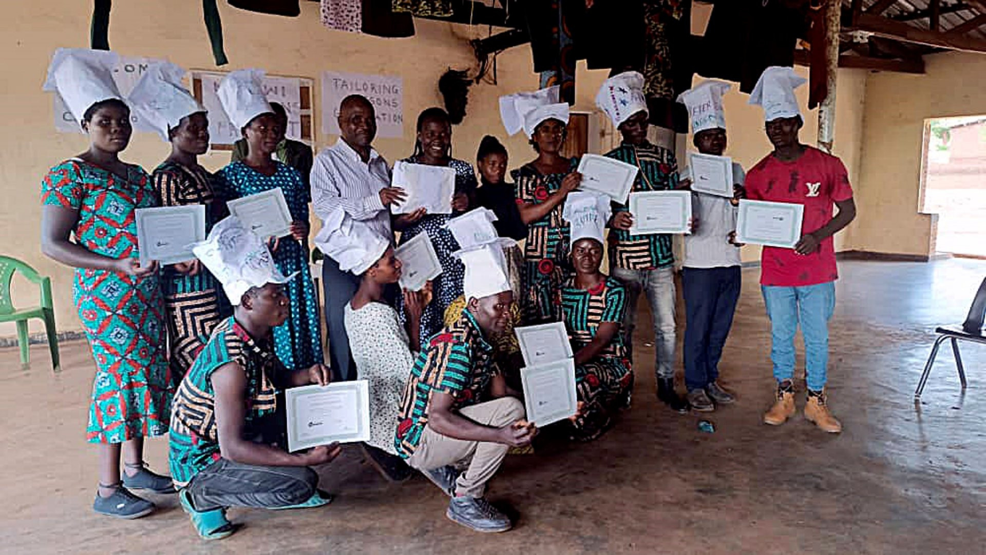 Proud tailoring program graduates, with their certificates.