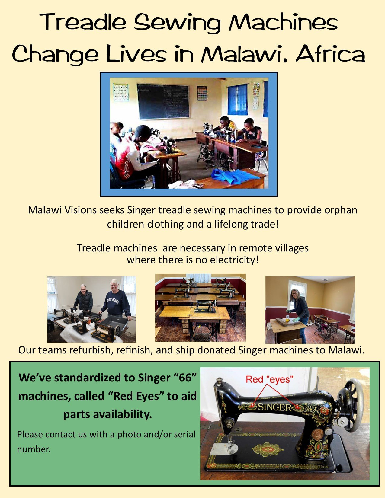 2. We can provide a letter on Malawi Visions letterhead that you donated a Singer sewing machine to us, a tax exempt humanitarian organization. You may be able to use that as a record of charitable donation for tax purposes.